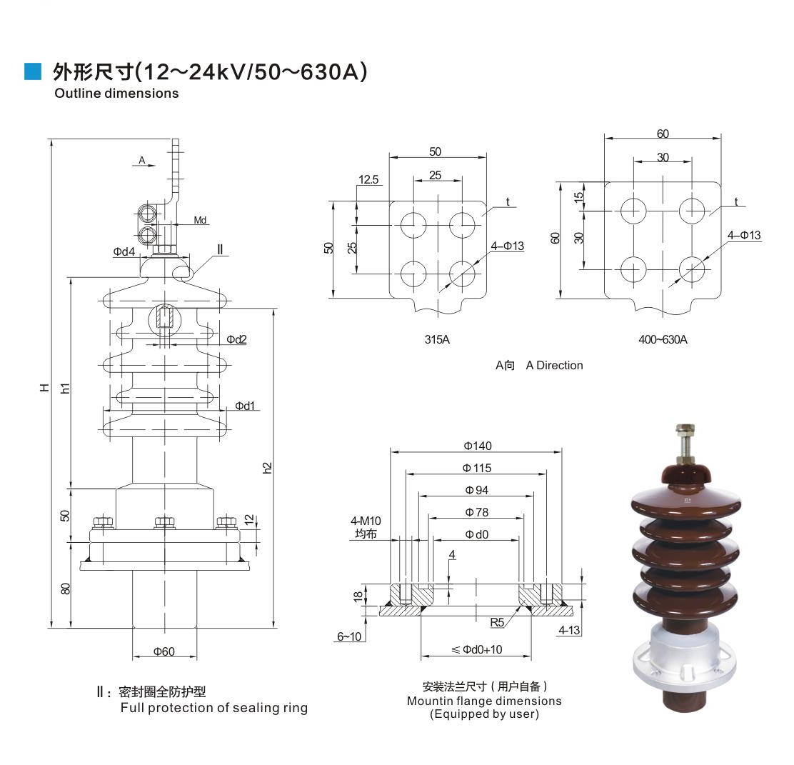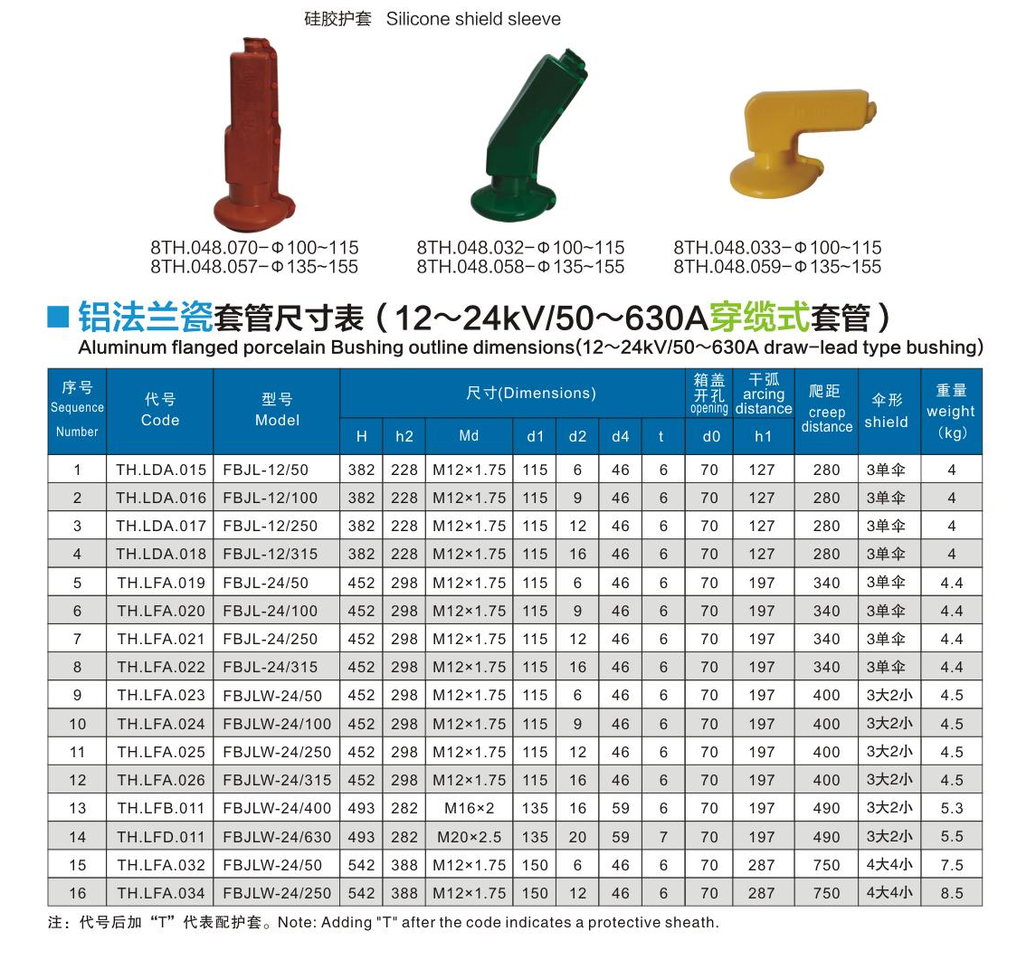 鋁法蘭瓷套管12~24kV/50~630A穿纜式套管